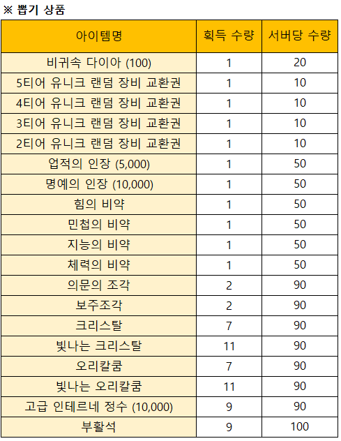 설명: 한정 뽑기에서는 랜덤하게 아이템을 획득 할 수 있습니다. 해당 뽑기를 이용하여서 다양한 아이템을 획득하고 희귀한 상품을 획득할 기회를 노려보세요!