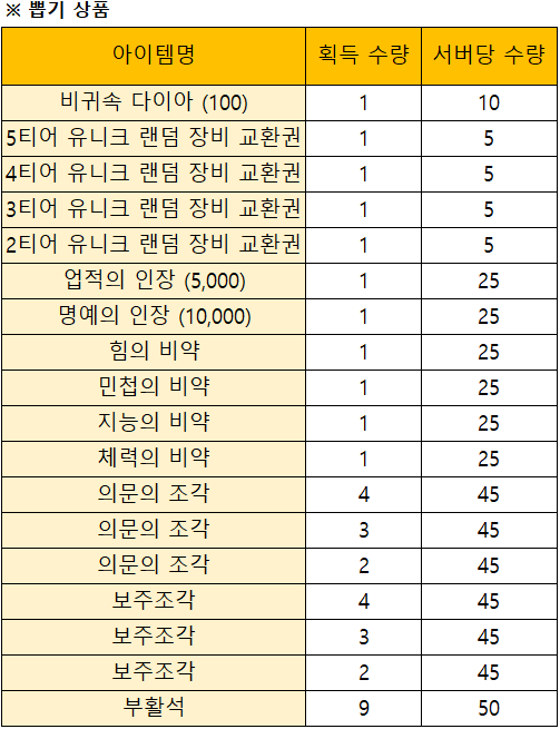 설명: 한정 뽑기에서는 랜덤하게 아이템을 획득 할 수 있습니다. 해당 뽑기를 이용하여서 다양한 아이템을 획득하고 희귀한 상품을 획득할 기회를 노려보세요!