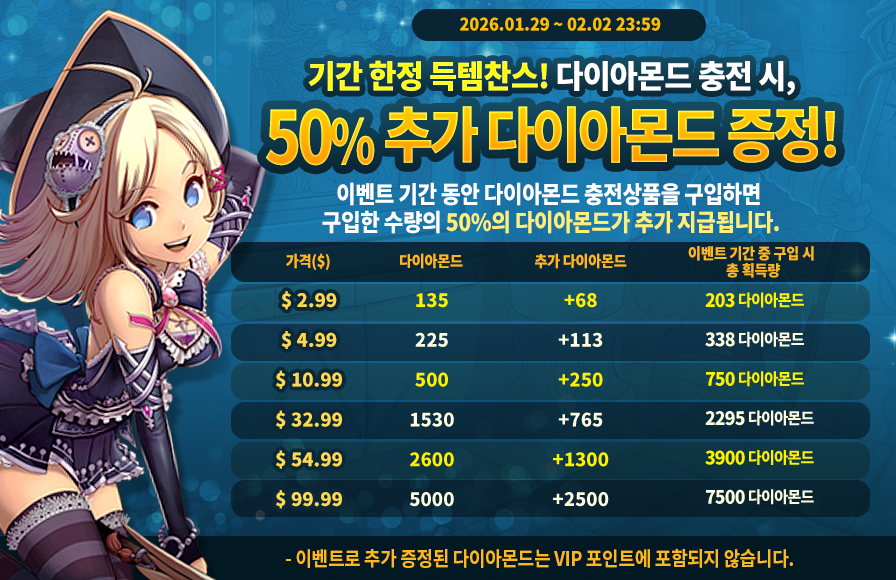 * 추가증정 다이아몬드는 VIP 포인트에 포함되지 않습니다.