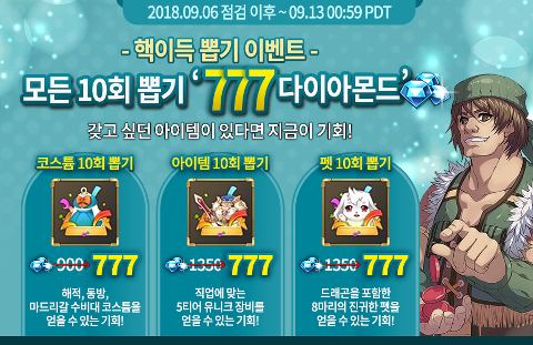 - 코스튬 10회 뽑기 900 다이아몬드 -> 777 다이아몬드