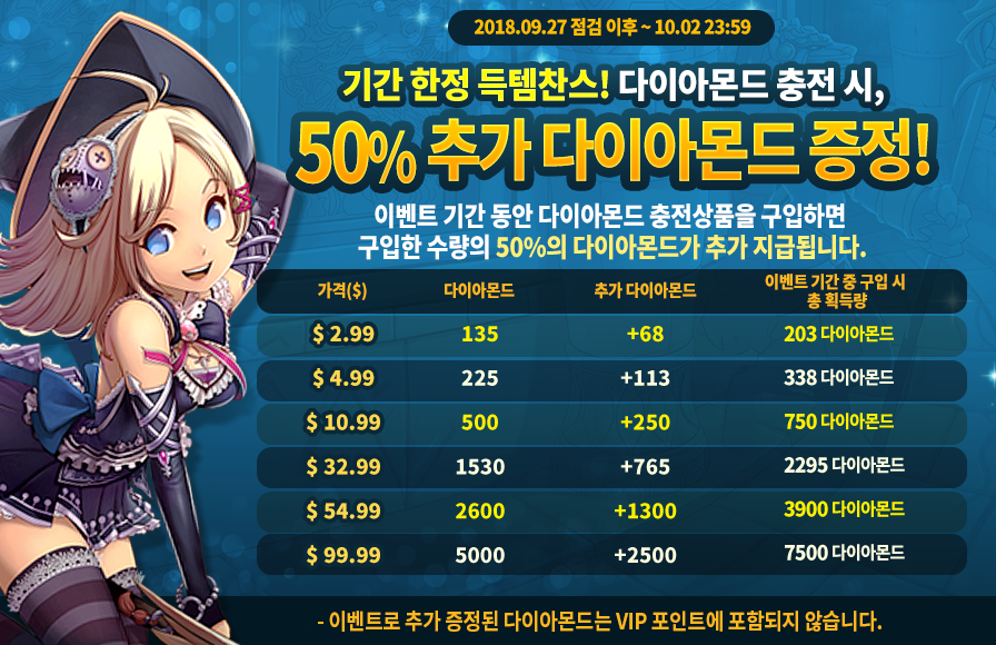 * 추가증정 다이아몬드는 VIP 포인트에 포함되지 않습니다.