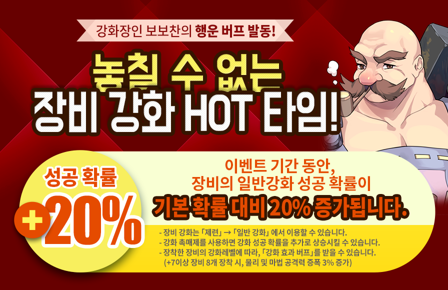 설명: 이벤트 기간 동안, 장비의 일반 강화 성공 확률이 기본 확률 대비 20% 증가됩니다.
