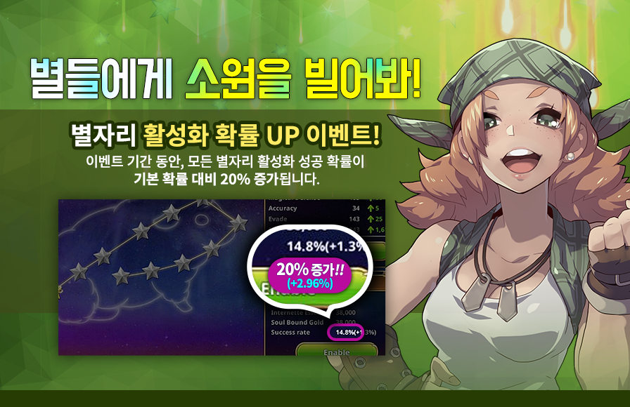 설명: 이벤트 기간 동안, 모든 별자리 활성화 성공 확률이 기본 확률 대비 20% 증가됩니다.
