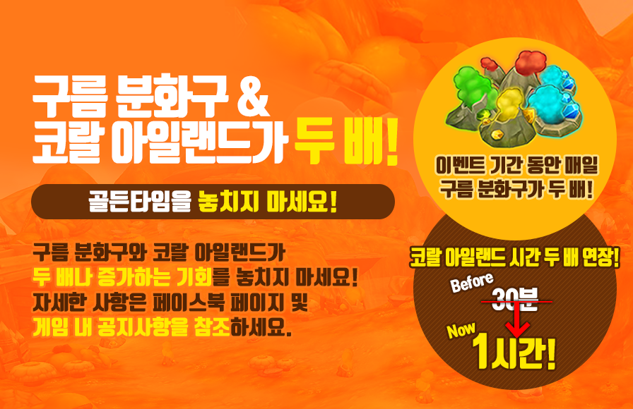 - 설명: 구름 분화구와 코랄 아일랜드가 두 배나 증가하는 기회를 놓치지 마세요!