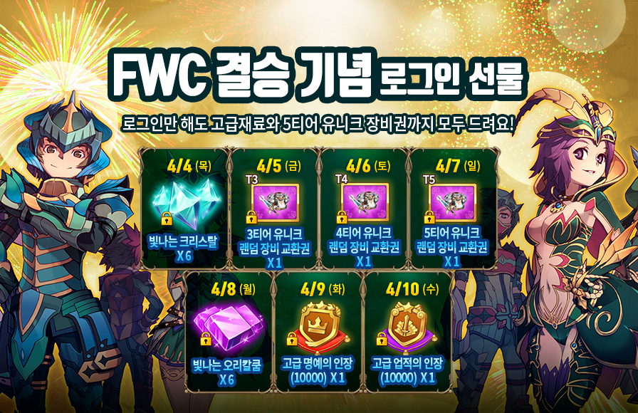 설명: 로그인만 해도 고급재료와 5티어 유니크 장비권까지 모두 드려요!