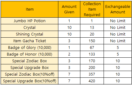 행운의 팬더 아이템은 스페셜 이벤트에서 다음과 같은 아이템으로 교환 할 수 있습니다.
