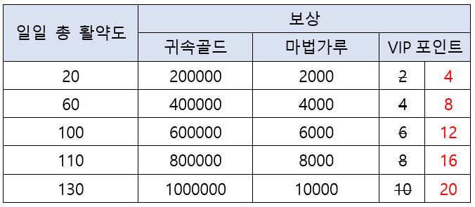내용: 이벤트 기간 중 총 활약도의 VIP포인트가 2배 증가합니다!
