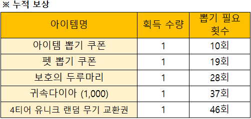 이벤트 보상은 아래의 표를 참조해주시길 부탁드립니다.