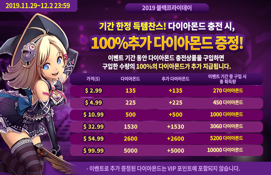 * 추가증정 다이아몬드는 VIP 포인트에 포함되지 않습니다.
