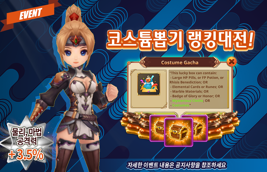 설명: 아주 진귀한 코스튬을 여러 개 뽑을 수 있는 코스튬 뽑기를 하시고 상품도 얻을 수 있는 기회!