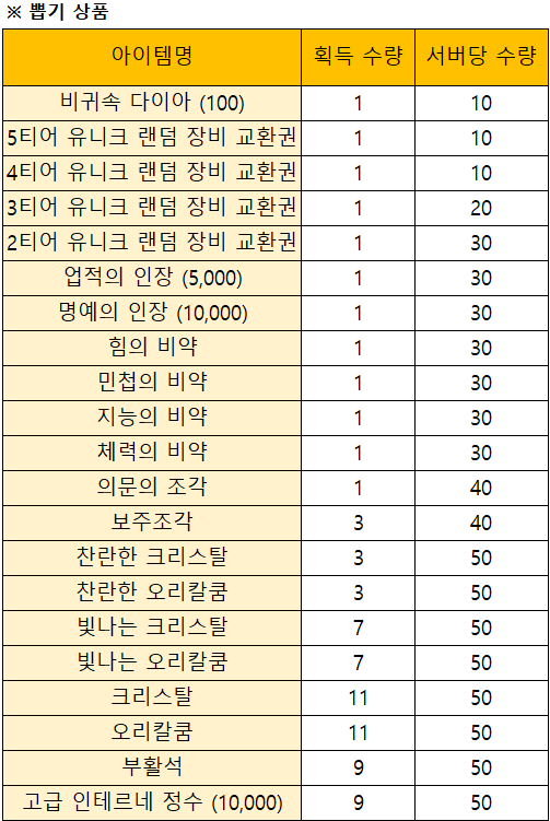 *상자를 열면 상기의 아이템 중 하나를 얻을 수 있습니다.