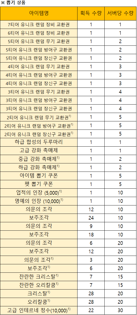 *상자를 열면 상기의 아이템 중 하나를 얻을 수 있습니다.