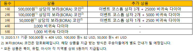 - 상품으로 지급되는 보라(BORA) 코인은 결과 발표일 직전일의 CoinMarketCap (https://coinmarketcap.com/currencies/bora/historical-data/)의 Close 가격 기준으로 지급됩니다. 상세한 사항은 우승자에게 별도로 안내됩니다.