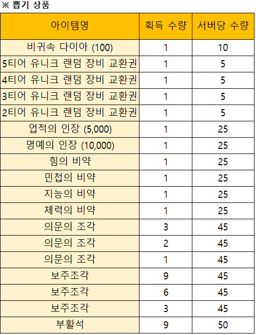 *상자를 열면 상기의 아이템 중 하나를 얻을 수 있습니다.