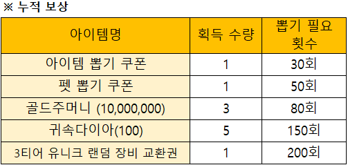 이벤트 기간 중에 획득 할 수 있는 보상은 아래와 같습니다.