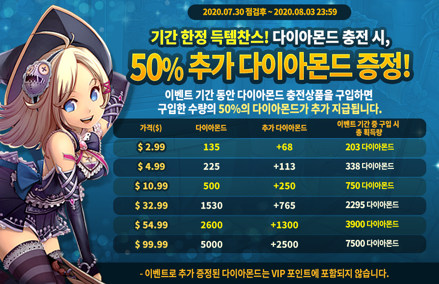 * 추가증정 다이아몬드는 VIP 포인트에 포함되지 않습니다.