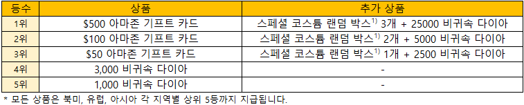 - 아마존 기프트 카드의 경우 우승자의 이메일로 코드로 발송 됩니다. 실물 카드가 유저들의 배송 되지 않는 점을 참고 부탁드리겠습니다.