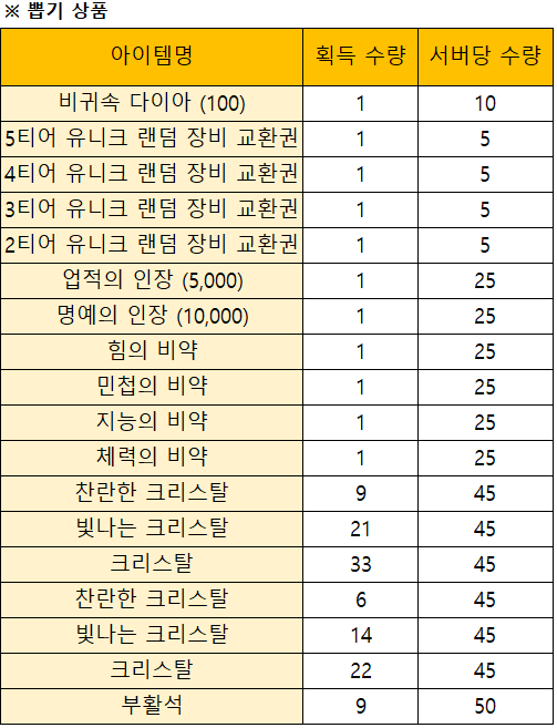 이벤트 보상은 아래의 표를 참조해주시길 부탁드립니다.