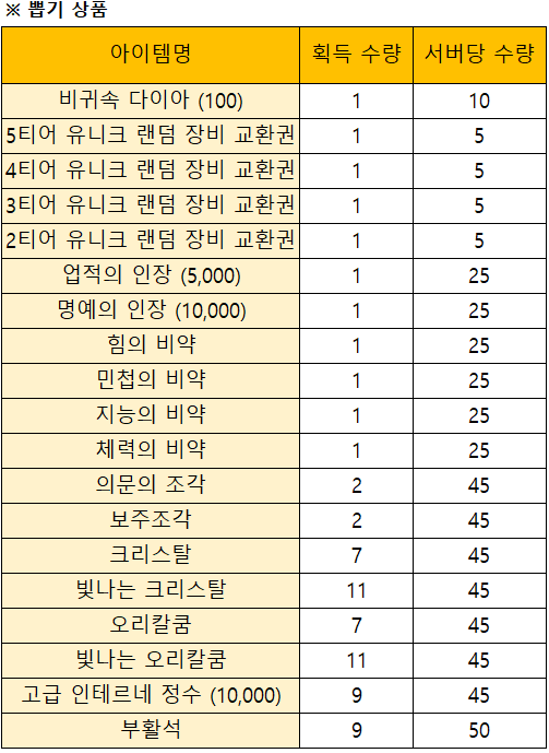 설명: 한정 뽑기에서는 랜덤하게 아이템을 획득 할 수 있습니다. 해당 뽑기를 이용하여서 다양한 아이템을 획득하고 희귀한 상품을 획득할 기회를 노려보세요!