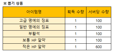 획득 할 수 있는 상품의 목록은 다음과 같습니다.