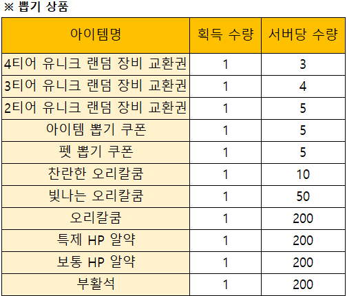 *상자를 열면 상기의 아이템 중 하나를 얻을 수 있습니다.
