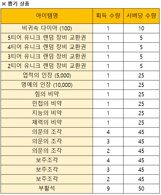 설명: 한정 뽑기에서는 랜덤하게 아이템을 획득 할 수 있습니다. 해당 뽑기를 이용하여서 다양한 아이템을 획득하고 희귀한 상품을 획득할 기회를 노려보세요!