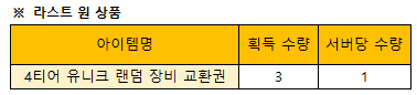 설명: 한정 뽑기에서는 랜덤하게 아이템을 획득 할 수 있습니다. 해당 뽑기를 이용하여서 다양한 아이템을 획득하고 희귀한 상품을 획득할 기회를 노려보세요!
