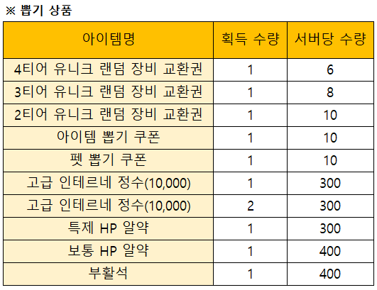 설명: 한정 뽑기에서는 랜덤하게 아이템을 획득 할 수 있습니다. 해당 뽑기를 이용하여서 다양한 아이템을 획득하고 희귀한 상품을 획득할 기회를 노려보세요!