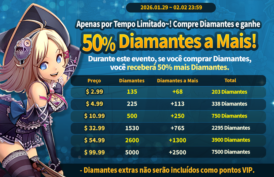 Se você comprar Diamantes, você receberá 50% de Diamantes extras! *