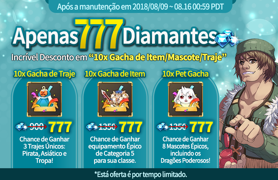 DESCRIÇÃO: Hora de comprar um pouco de Gacha! Desconto INCRÍVEL em pacotes 10x Gacha! Por tempo limitado!