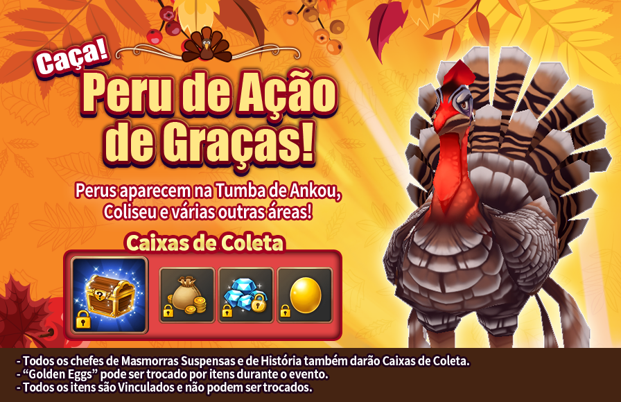 Os Perus de Ação de Graças dão as Caixas de Coleta nas quais você pode obter o Diamante Vinculado (1), o Penya VInculada (50.000) ou o Ovo de Ouro(1), que você pode trocar por itens do evento.