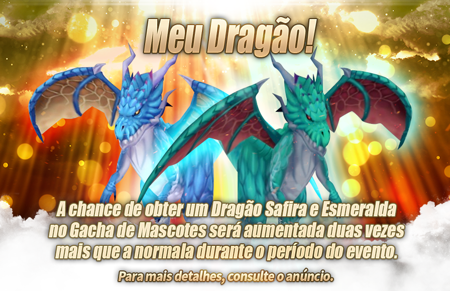 A chance de obter um Dragão Safira e Esmeralda no Gacha de Mascotes será aumentada duas vezes mais que a normala durante o período do evento.