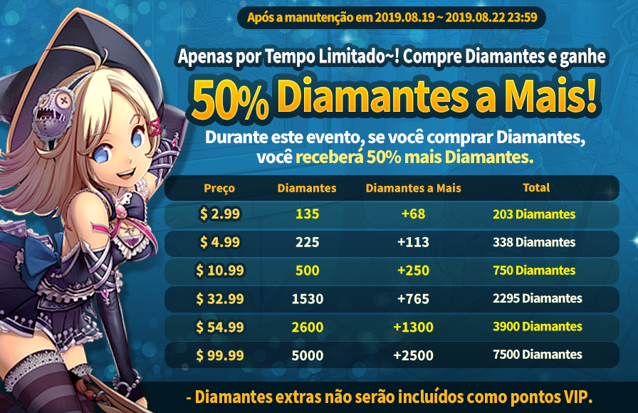 DESCRIÇÃO: Se você comprar Diamantes, você receberá 50% de Diamantes extras! *