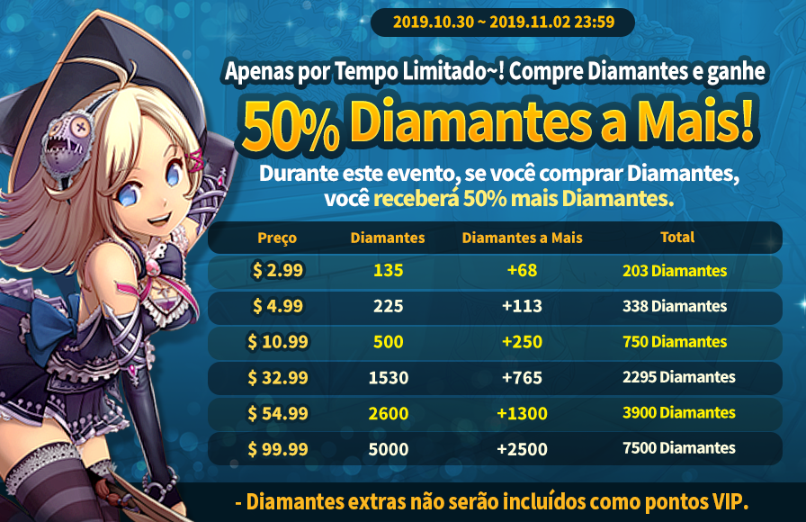 DESCRIÇÃO: Se você comprar Diamantes, você receberá 50% de Diamantes extras! *
