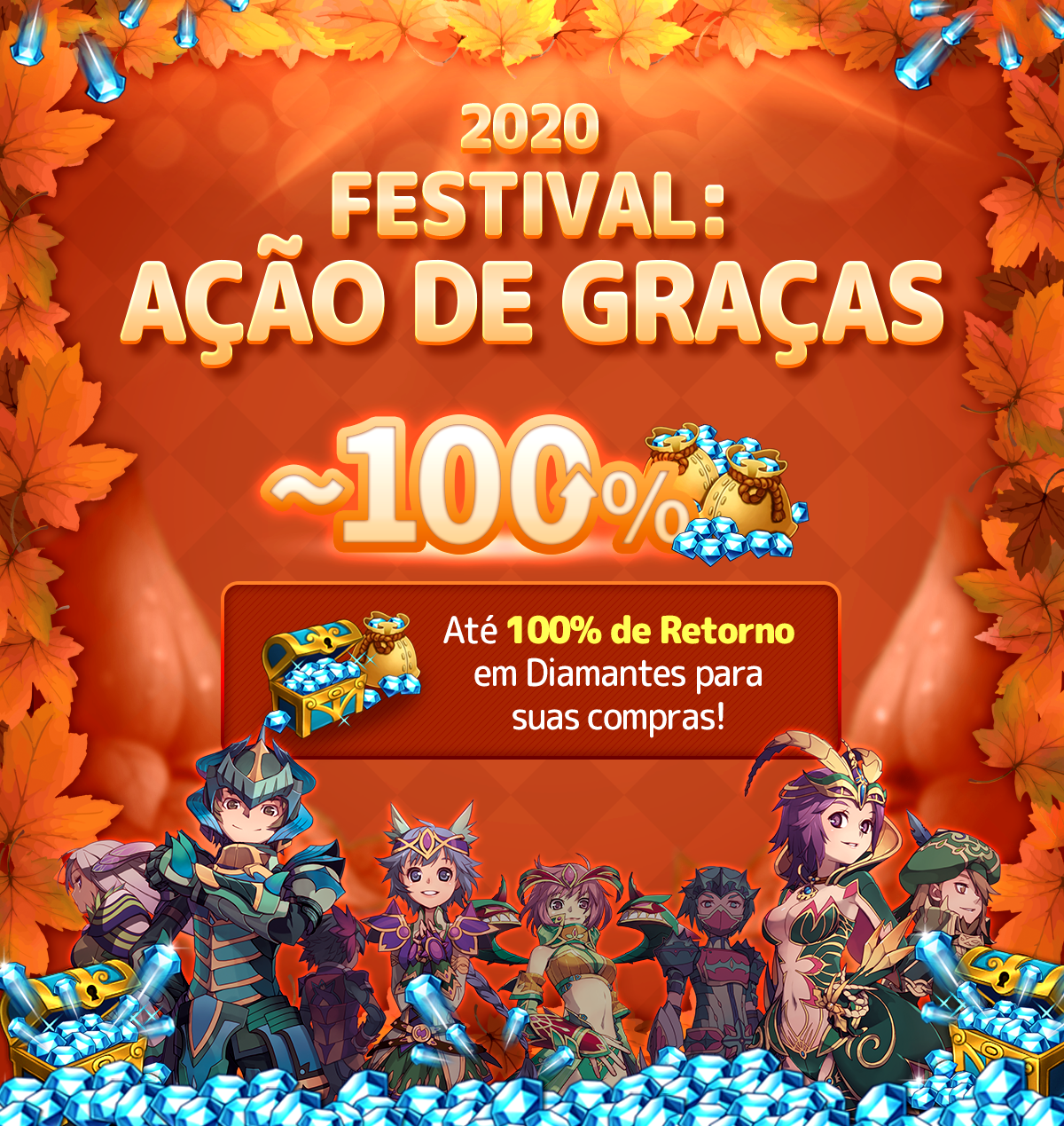 Você está pronto para provar seu poder neste Dia de Ação de Graças? Estaremos realizando um Torneio Arena especial, com um evento especial que pode dar a você até 100% de retorno em diamantes! Não perca esta chance de glória e tesouros, concedida apenas ao Flyffer mais poderoso!