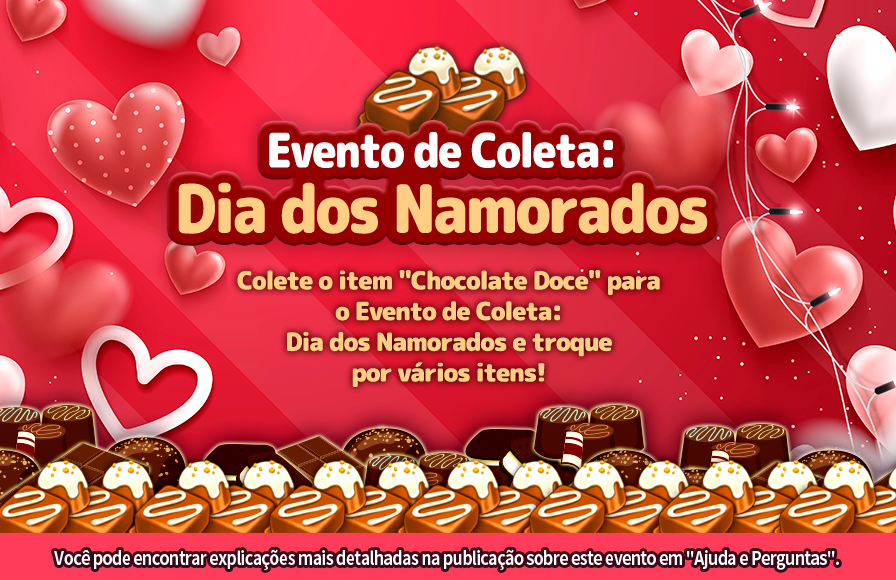 O item "Chocolate Doce" não pode ser obtido após 2.16.2022 23:59, NO ENTANTO, você ainda pode trocar itens até 2.17.2022 23:59. Após o período de troca, o item será excluído da sua bolsa durante a manutençã. Antes disso, você pode vendê-los para Penya Vinculada.