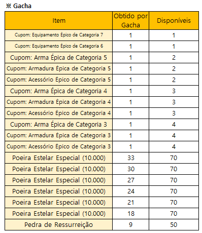 Descrição: Você pode obter itens aleatórios neste Gacha Limitado. Use esta chance para obter vários itens e a chance de ganhar um prêmio raro!