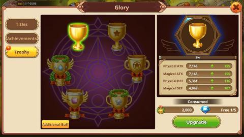 Персонажи со степенью 5 и выше Чести и Славы могут обновлять Трофеи. Каждый трофей можно бесплатно обновить с помощью очков славы и почетных жетонов (5 раз в день). Соберите 6 трофеев, чтобы получить более мощные б