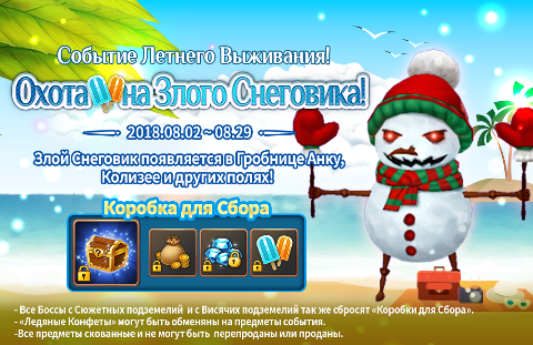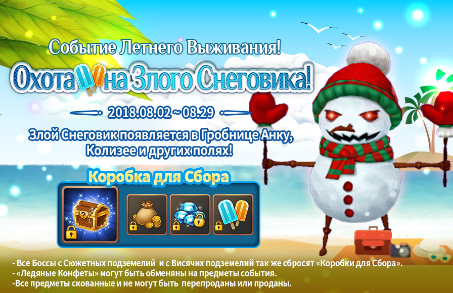 Злые Снеговики сбросят «Коробки для Сбора» из которых вы можете получить либо Скованные Алмазы (1),СК Пени (50 000) или Ледяные Конфеты (1), которые вы можете обменять на предметы события.