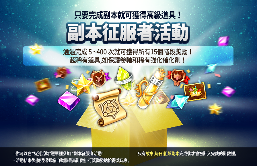 每個伺服器最多完成副本次數的玩家1人,將可獲得10,000鑽石的特殊獎勵。