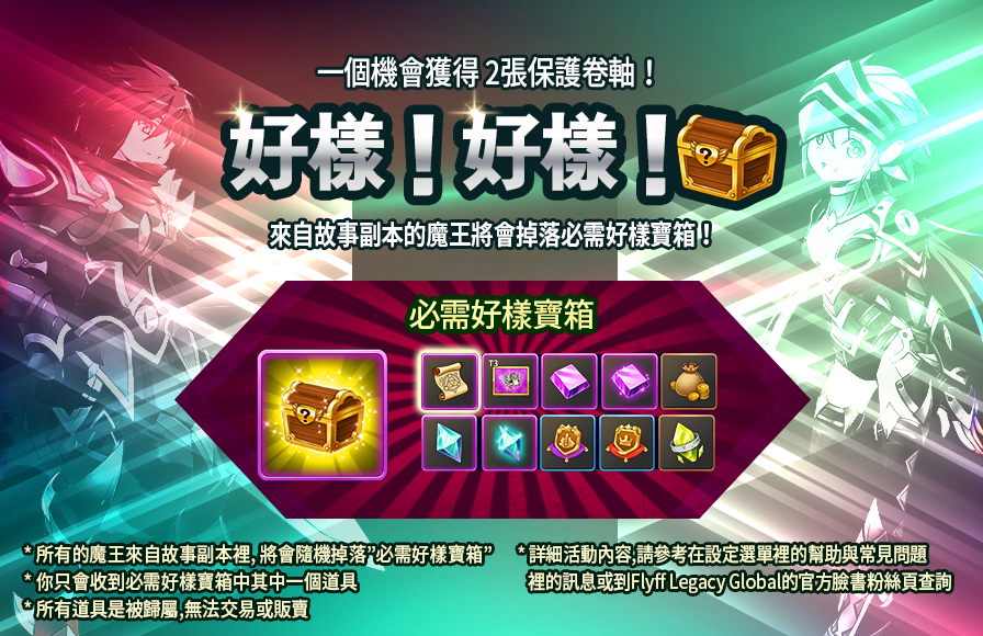活動內容:故事副本和空中副本首領魔王有機會掉落“必需品寶箱”和“個人珍寶箱”,