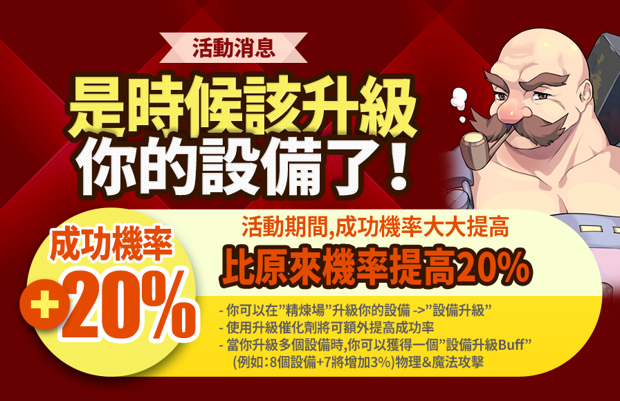 活動內容:活動期間內,強化裝備的成功機率比原來的機率增加20%。