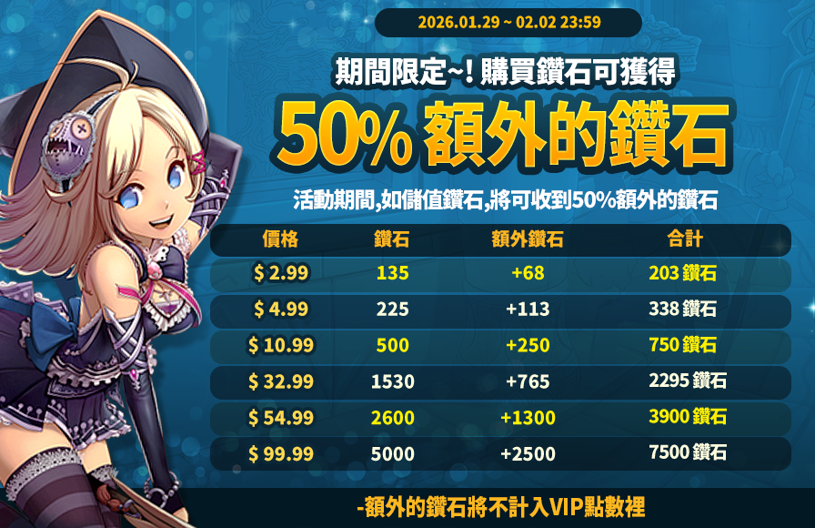活動期間內,儲值鑽石將可獲得50%額外的鑽石!