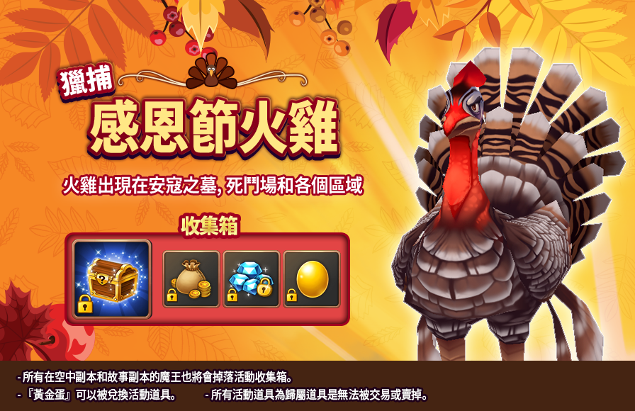 活動說明:感恩節火雞魔王出現在安寇之墓,死鬥場和各個區域!