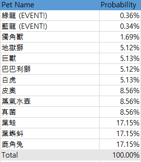 ★寵物轉蛋列表 (從 10 寵物轉蛋, 如果9隻寵物中的一隻或多隻是史詩,則為第10隻寵物的機率 )