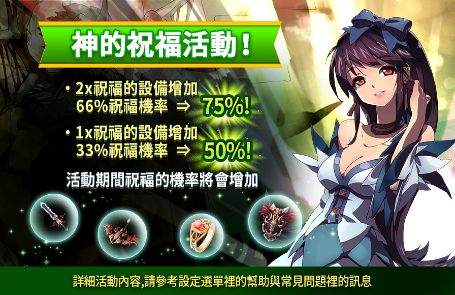 活動說明:在馬德里加爾,限定時間內你將被追封神的祝福!享受祝福同時熔合祝福的裝備,並獲得更多好處!