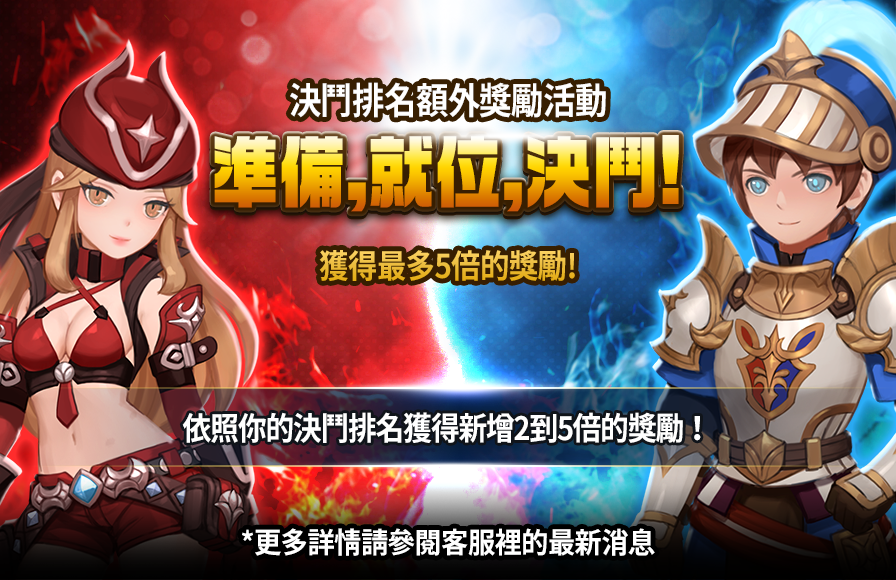 每台伺服器的前50名決鬥者每天都可獲得一次增強獎品。 你將根據你的決鬥排名獲得獎勵,該排名以決鬥者所在伺服器的時間,每天00:00刷新一次。 排名1到3可以獲得原本獎勵的5倍,排名4到10可以獲得3倍,排名11到50可以獲得原本獎勵的2倍。