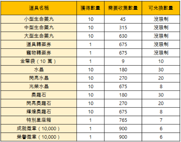 [10K高級榮譽徽章/ 10K高級成就徽章/ 300K高級星辰精華/ 500K高級星辰精華/ 1M高級星辰精華]